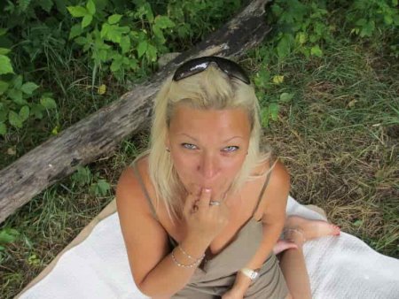 Зрелая блондинка стоит у дерева, слегка придерживая платье, которое сползает с плеч. Она оглядывается на пустые дорожки, улыбается и обнажает тело. Камера медленно приближается, фиксируя контуры груди и мягкий блеск кожи. Естественный свет подчёркивает плавные линии и лёгкое движение волос.