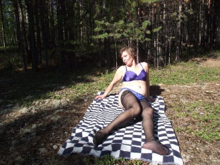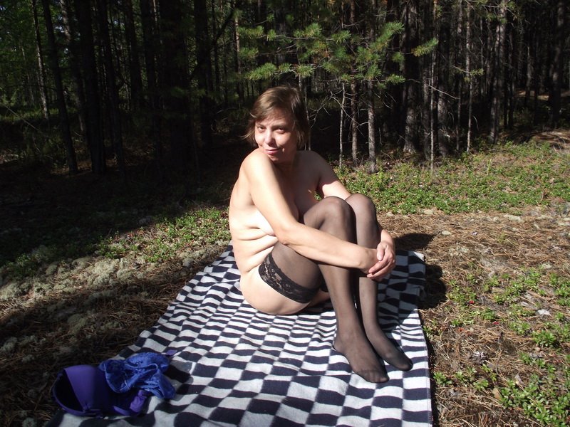 Ирина выбравшись на природу и постелив на травке покрывало эротично позирует в нижнем белье и чулках а затем сняв с себя белье и раздвинув ножки показала свою похотливую голую пизду
