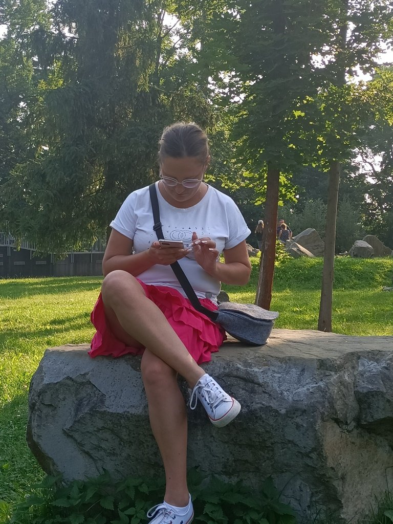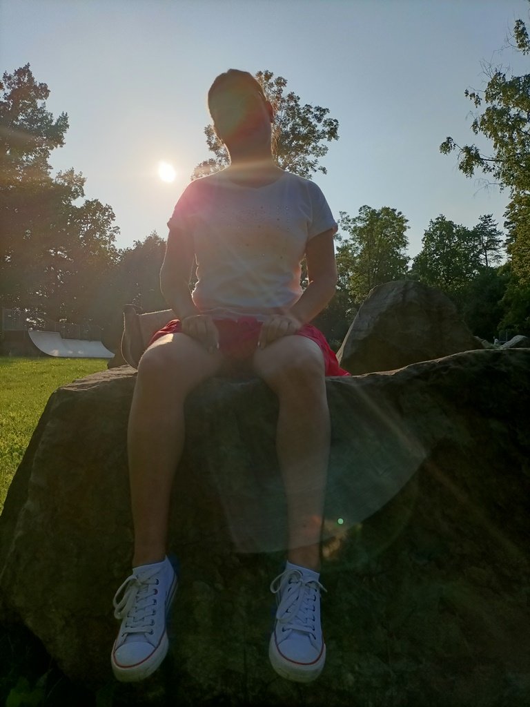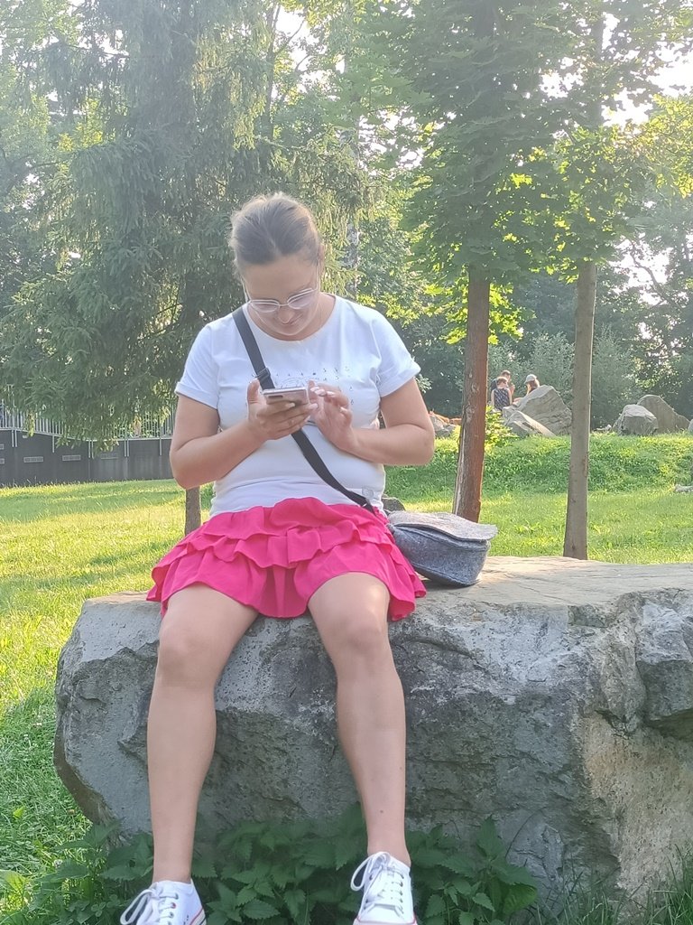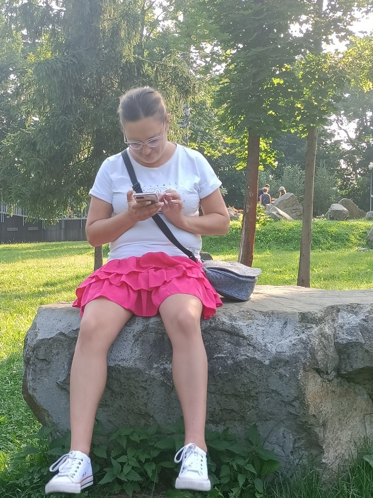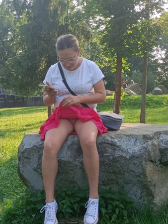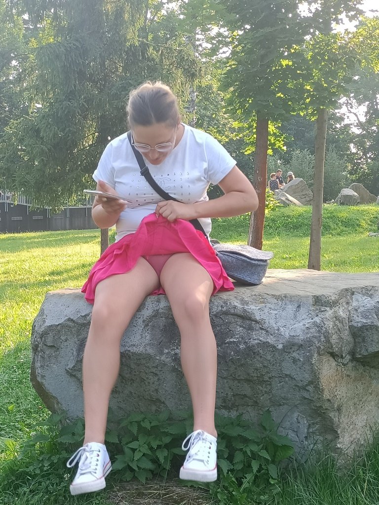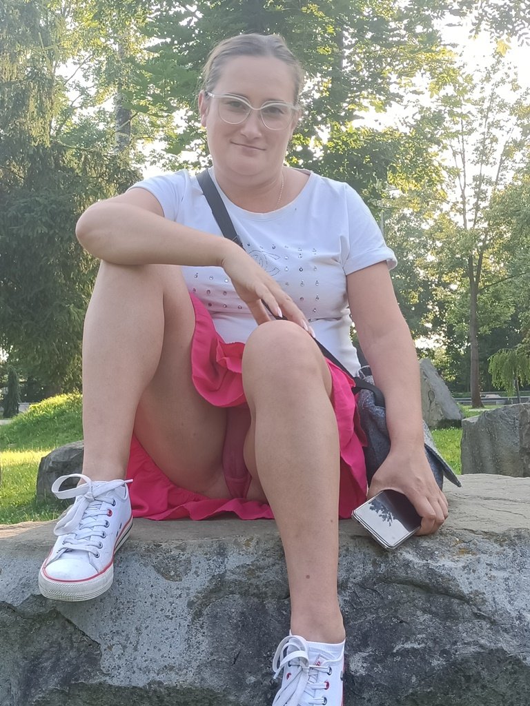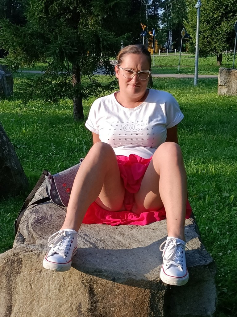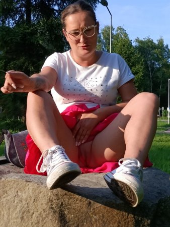 Жена гуляя в парке села на камень и задрав платье показала свои прозрачные трусики сквозь которые можно было увидеть ее голую пизду но она стащив трусики показывает свою голую киску на публике в парке
